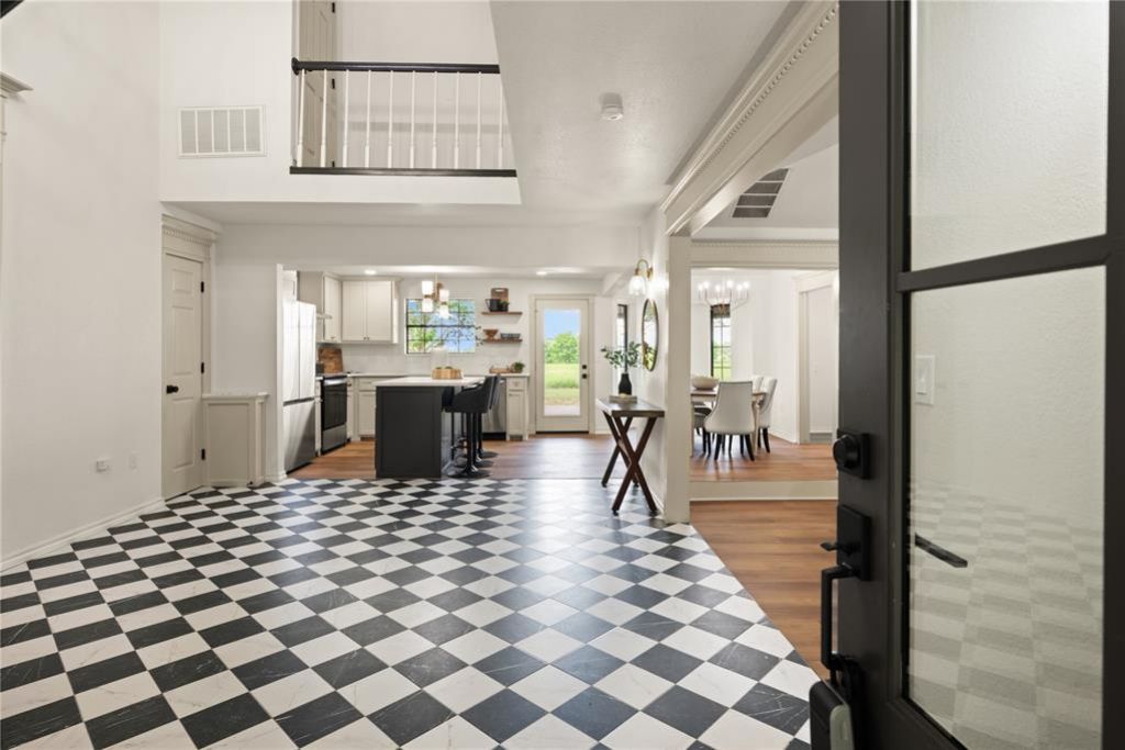 Peaceful country setting. Washington School District. Minutes from I-35, shopping, dining, and the OU campus.This charming Tudor-style home has been beautifully remodeled and offers a rare balance of privacy and convenience. A grand entry with an exposed staircase and chandelier opens to a spacious living room with vaulted ceilings and a full-length stone fireplace, creating a warm and impressive first impression. The home has been thoughtfully updated while still preserving original character.The layout is highly functional, with each bedroom featuring its own full bathroom. The fourth bedroom includes a private entrance and full bath-ideal for a guest suite, second living area, home office, or study.Outside, enjoy peaceful farmland views from the backyard, patio, and balcony. The large backyard provides space for outdoor living, recreation, or future additions, including room for a pool or workshop on the existing concrete pad. An extra-deep, fully insulated garage adds even more flexibility.